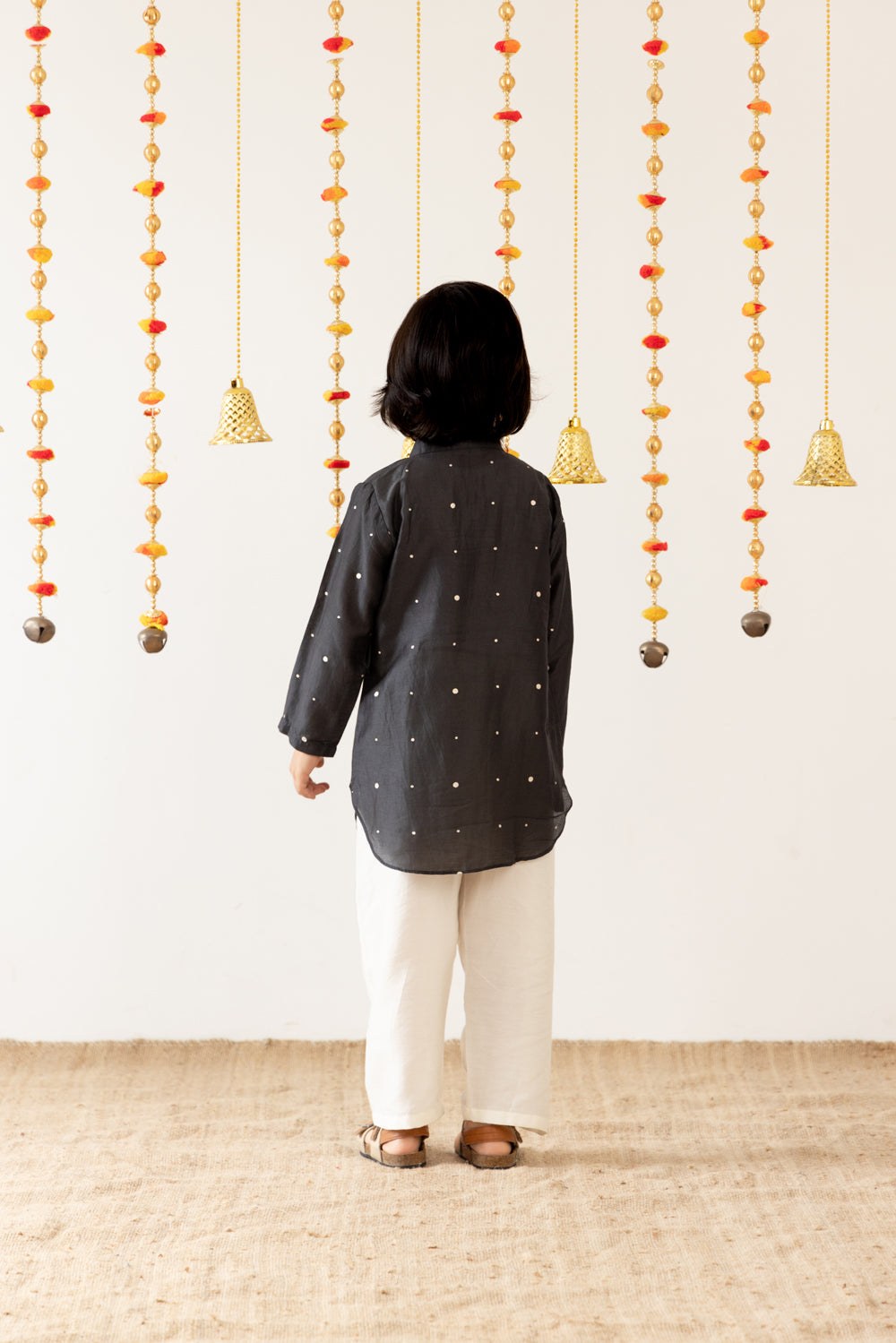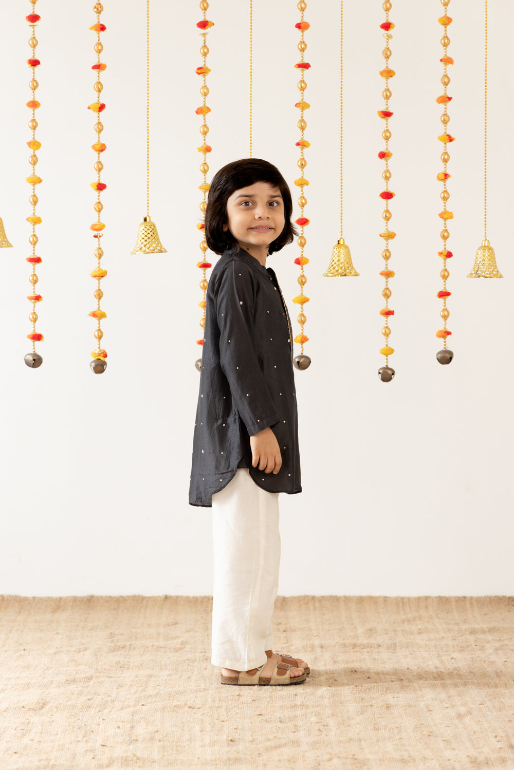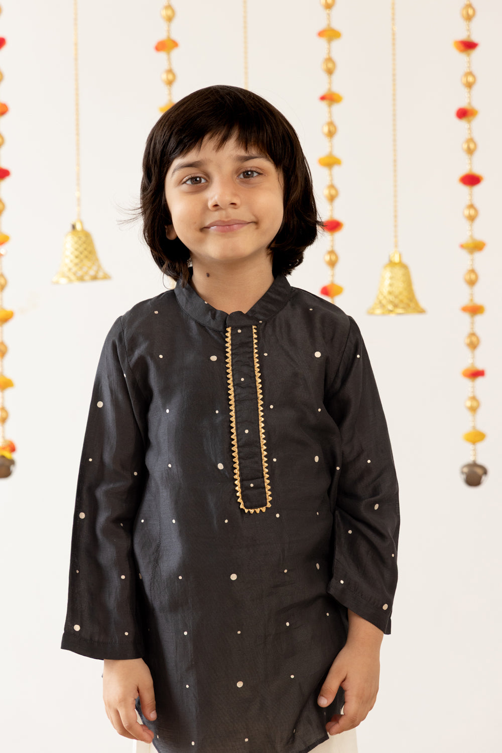 Brighten up their wardrobe with this royal black and gold kurta featuring playful gold polka dots. Designed in soft, breathable muslin fabric, it has a minimal mandarin collar and delicate detailing on the placket. Perfect for festive days or celebrations.