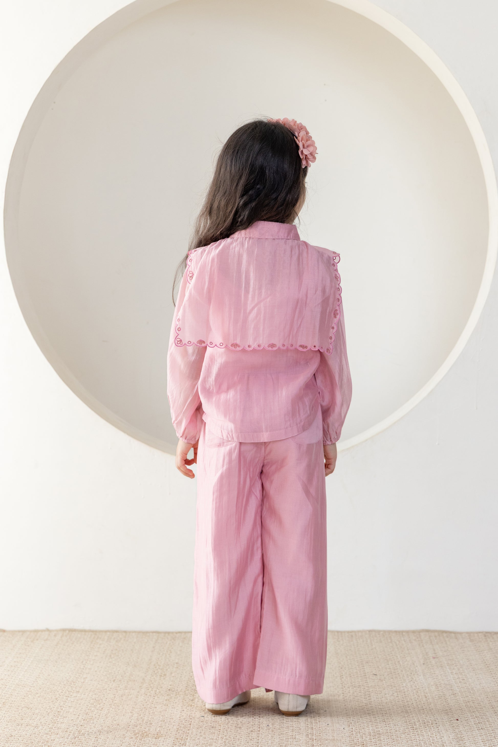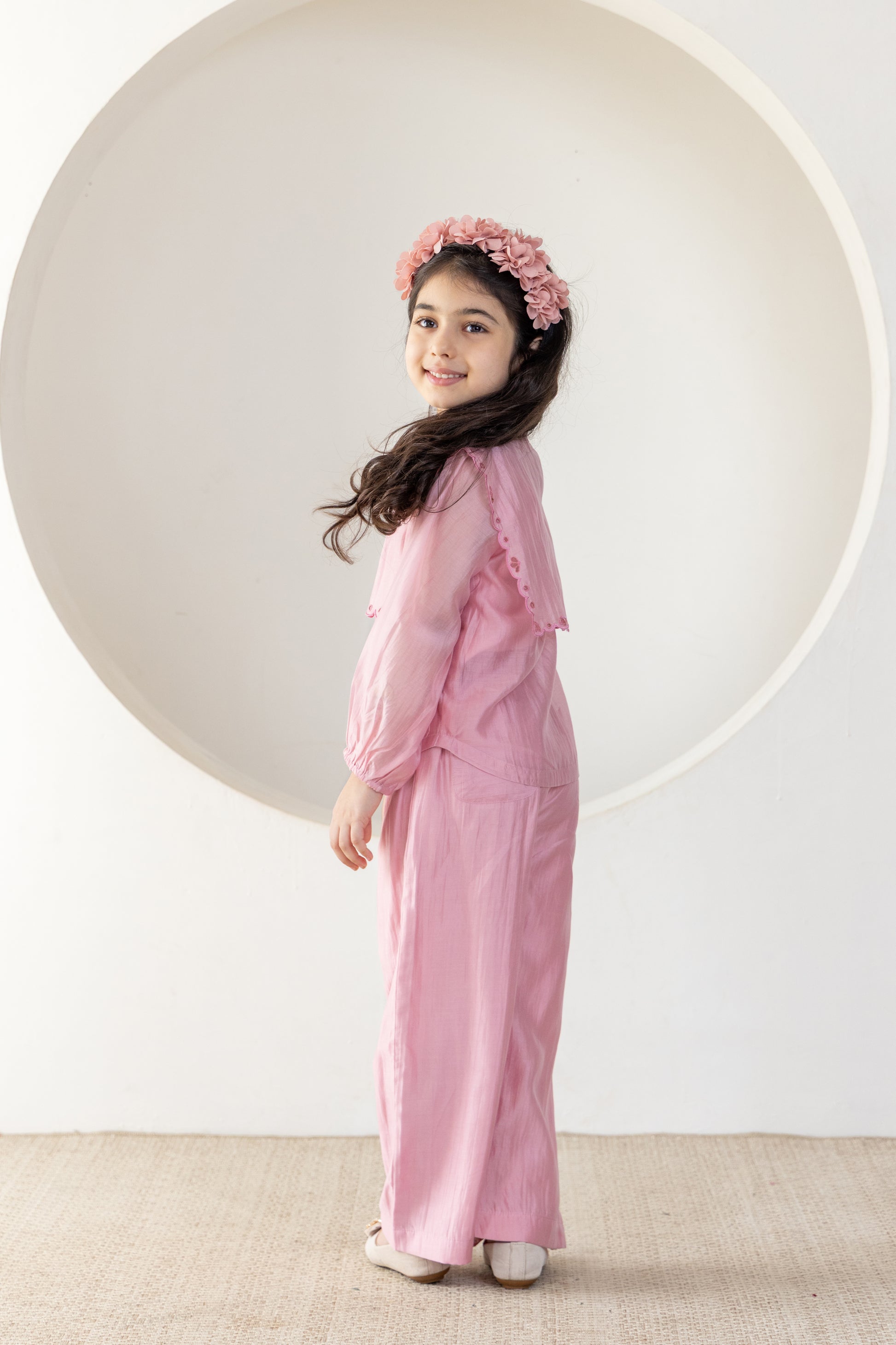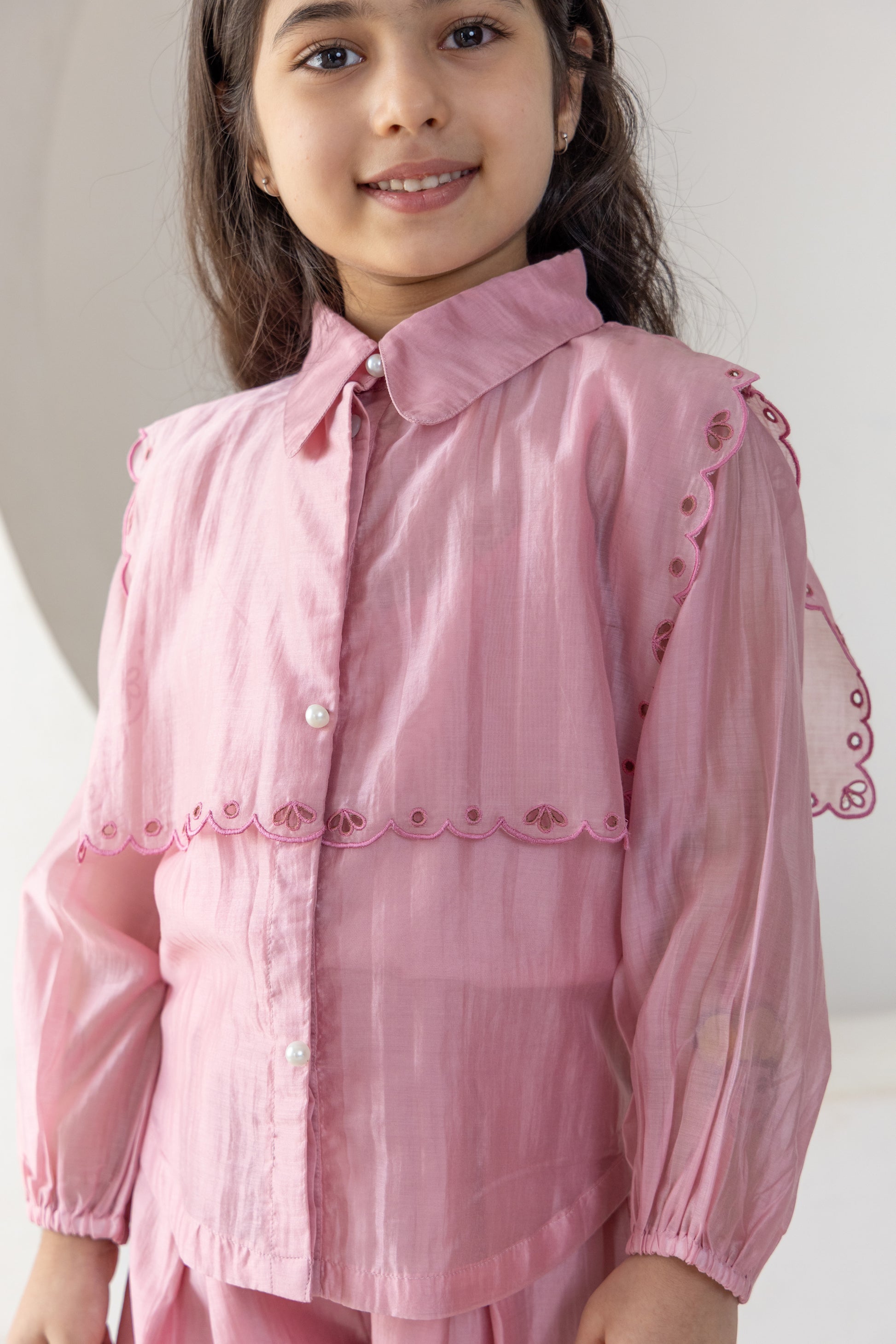 Charming and elegant, this blush pink co-ord set is perfect for your little fashionista. It features a puff-sleeve top with scalloped embroidered overlay and matching flared pants. Made from soft, breathable fabric, it ensures all-day comfort with a touch of graceful style—ideal for festive occasions, birthdays, or casual outings.