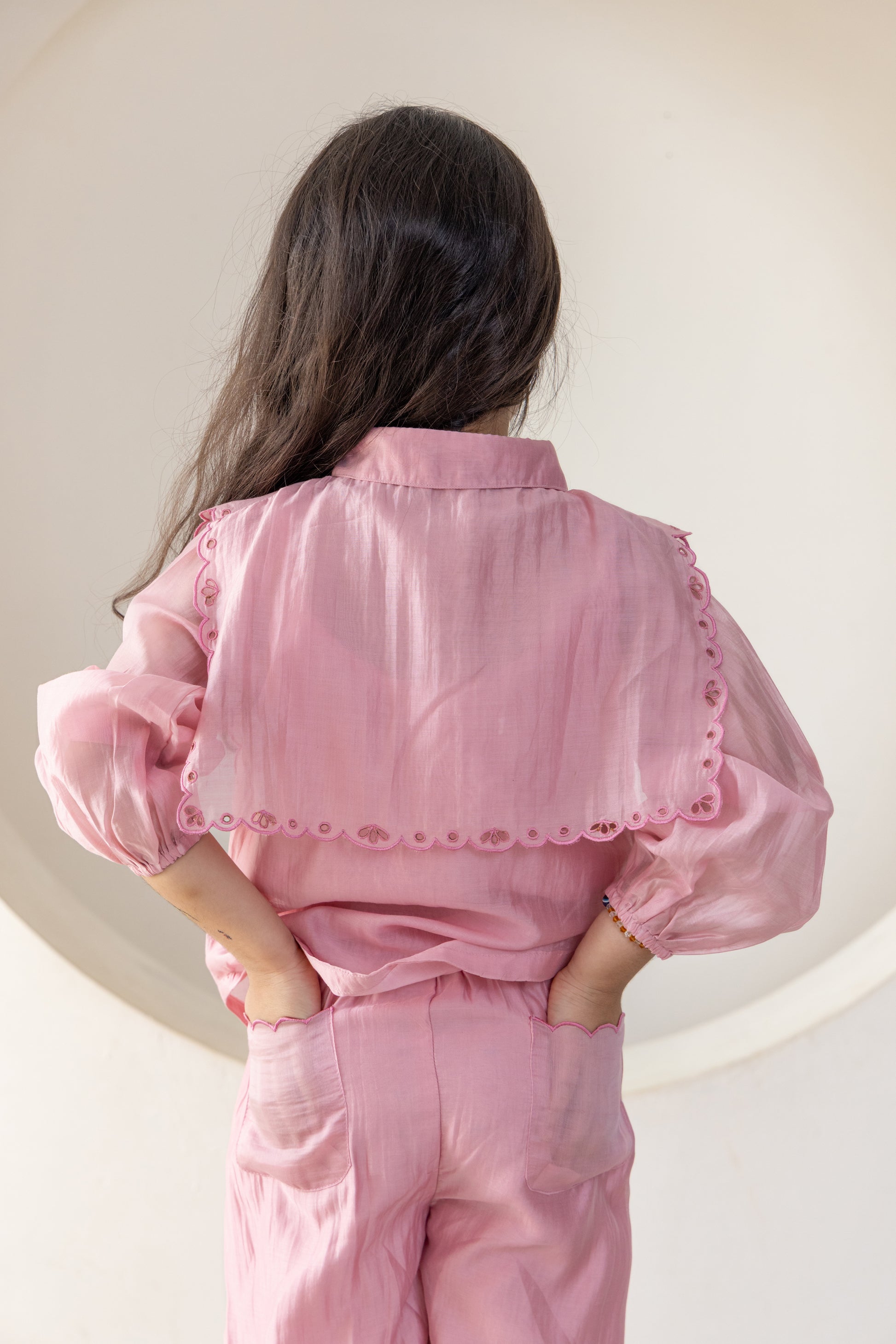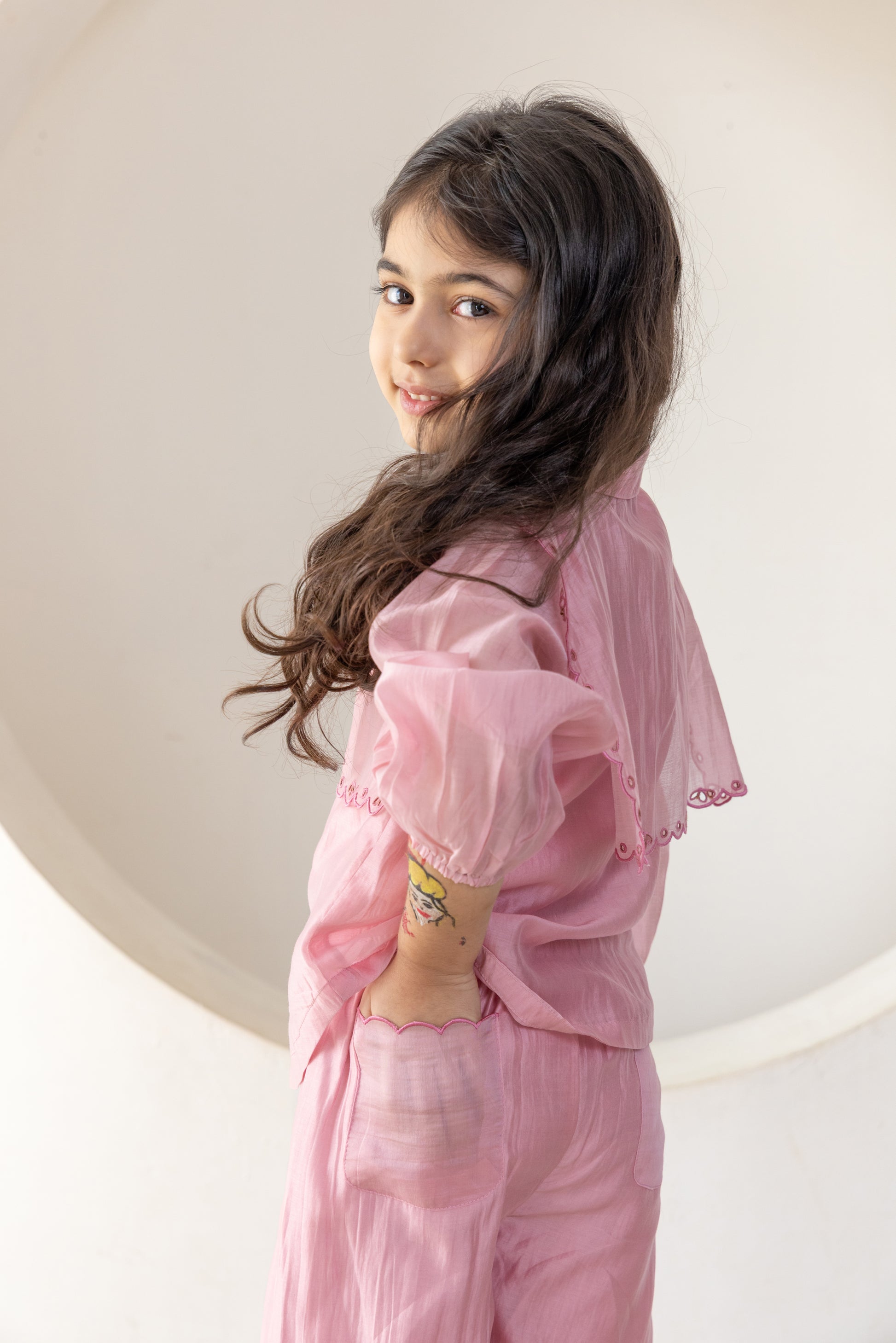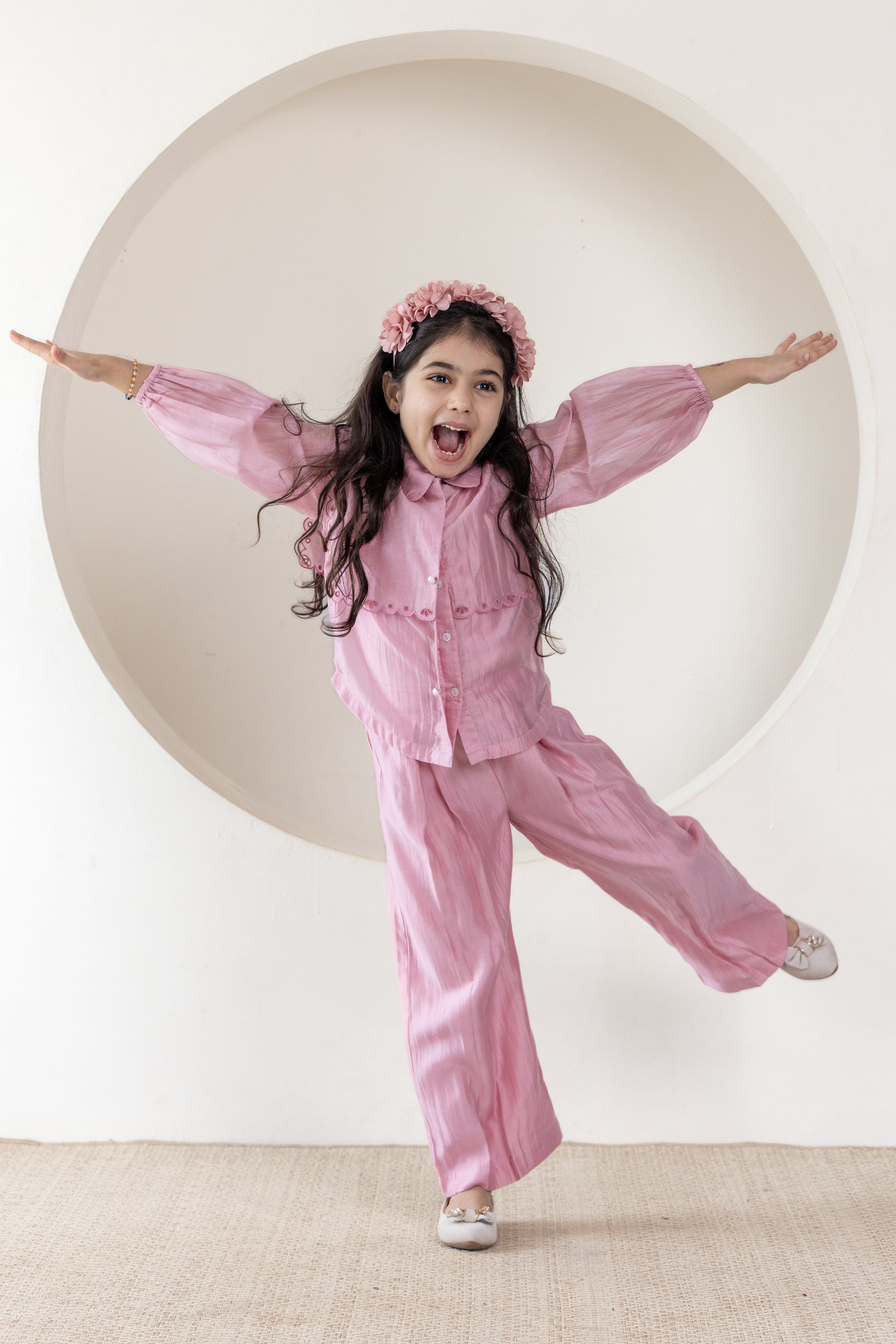 Charming and elegant, this blush pink co-ord set is perfect for your little fashionista. It features a puff-sleeve top with scalloped embroidered overlay and matching flared pants. Made from soft, breathable fabric, it ensures all-day comfort with a touch of graceful style—ideal for festive occasions, birthdays, or casual outings.