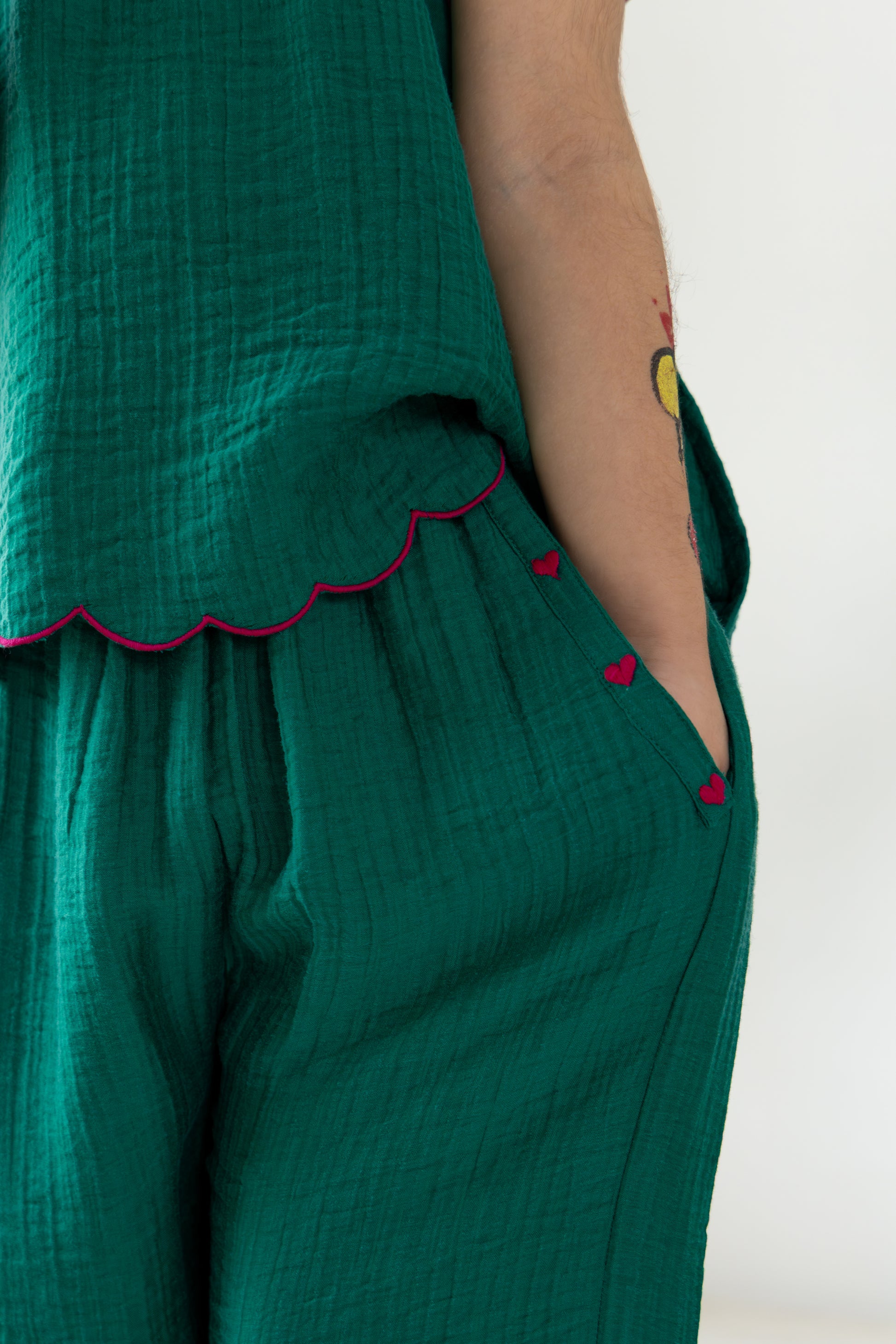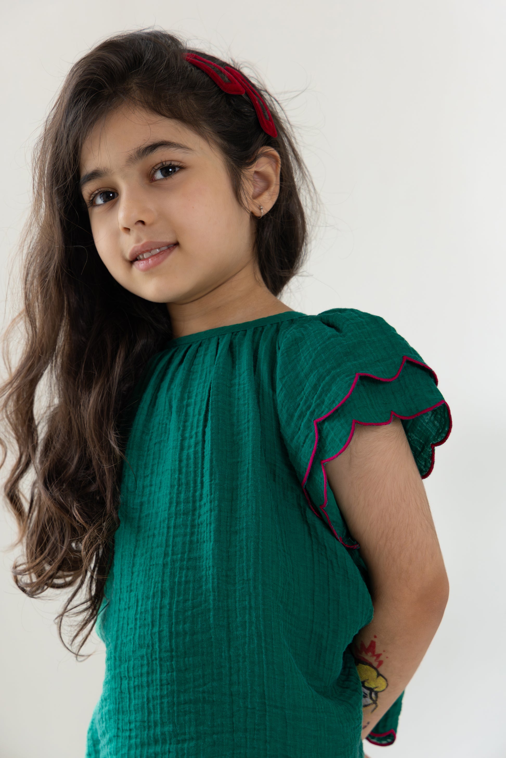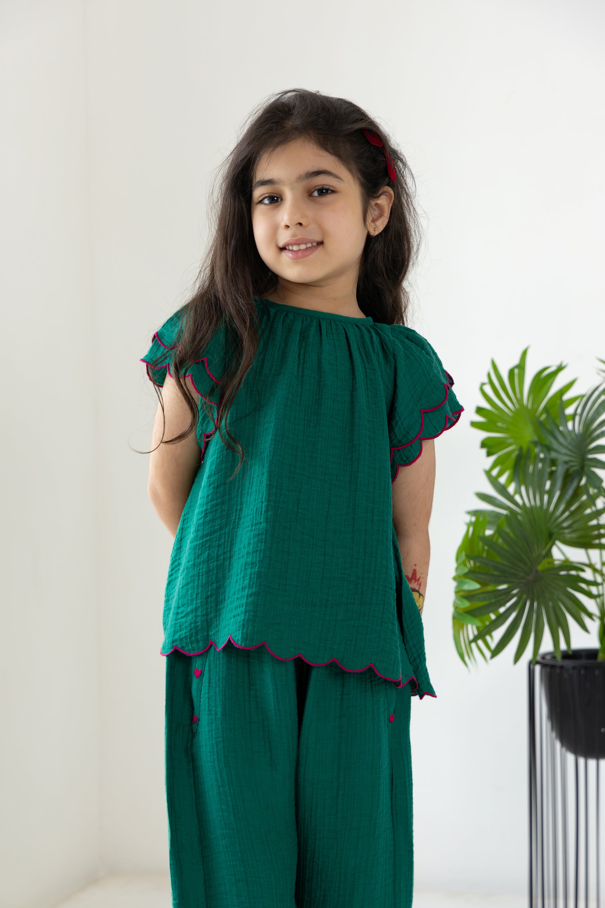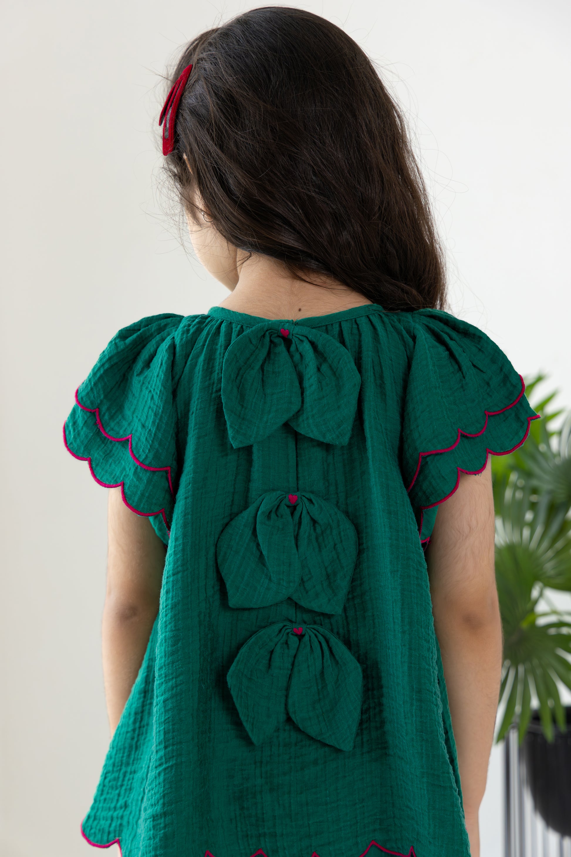 A stylish emerald green co-ord set featuring a soft tencel fabric top with scalloped sleeves and contrast scalloped edging. The back of the top is adorned with three charming fabric bows, adding a playful and elegant touch. Paired with matching relaxed-fit pants, this outfit blends comfort with effortless charm — perfect for festive days or casual outings.