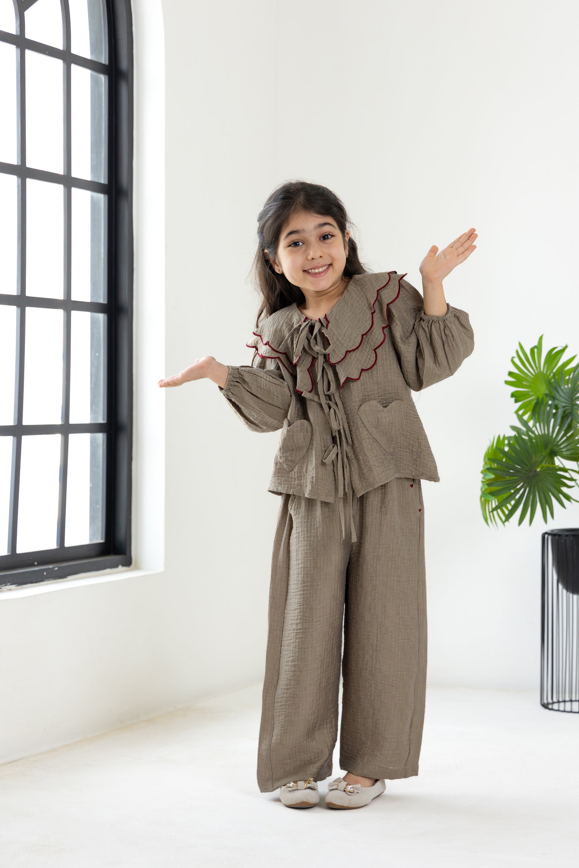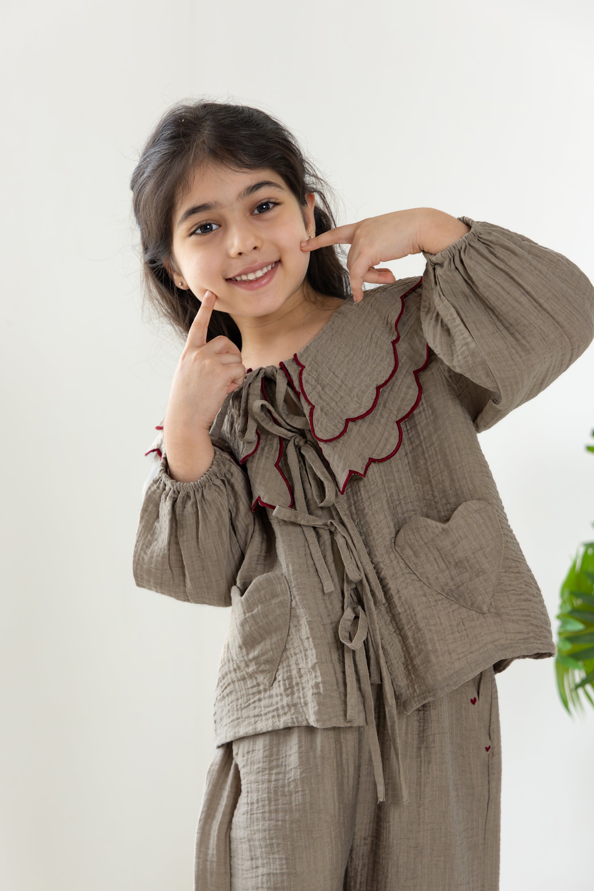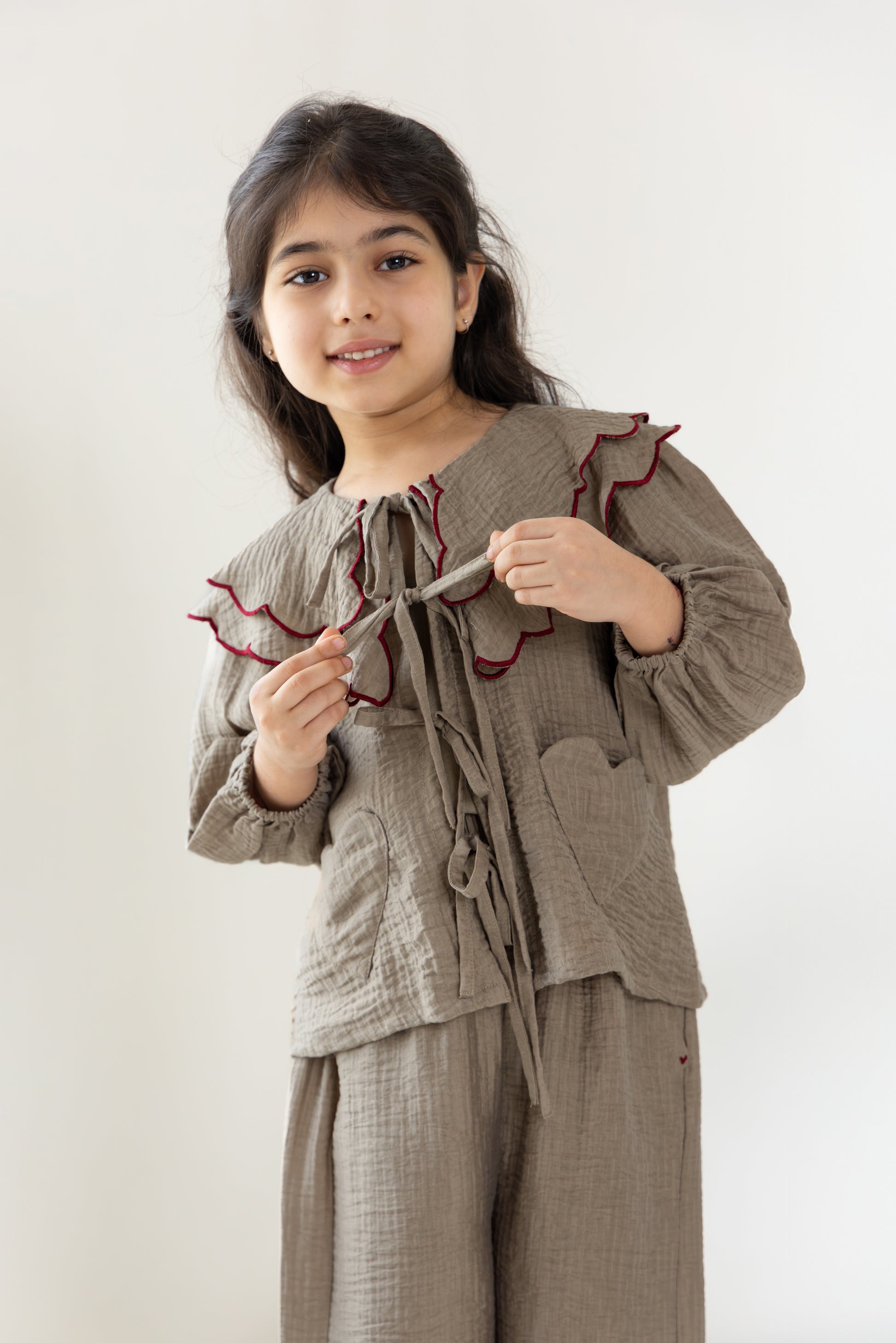 A stylish front tie-up co-ord set featuring a soft tencel fabric top with scalloped neck and contrast scalloped edging. The front of the top is adorned with tie-ups and heart shaped pockets adding a playful and elegant touch. Paired with matching relaxed-fit pants, this outfit blends comfort with effortless charm — perfect for festive days or casual outings.