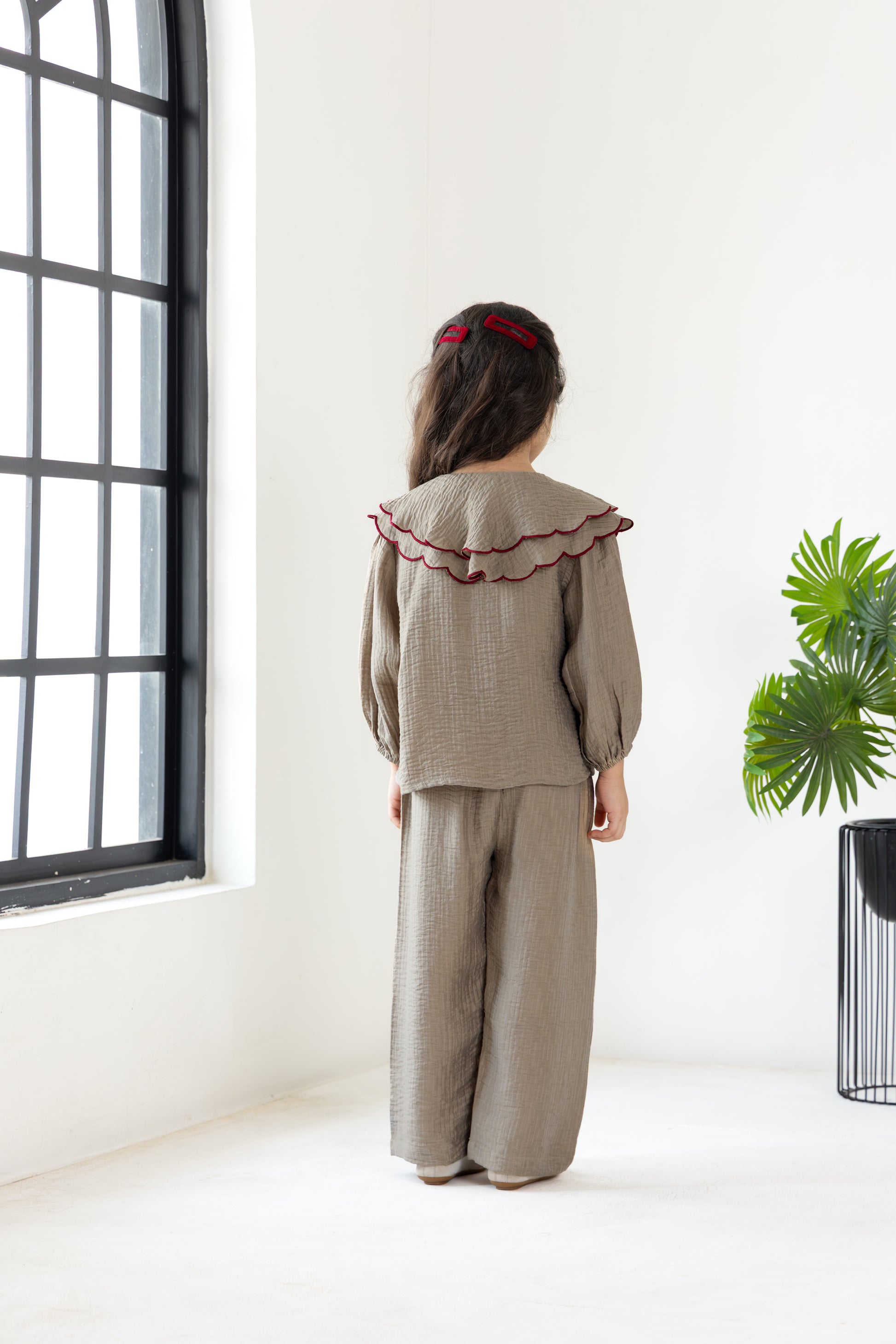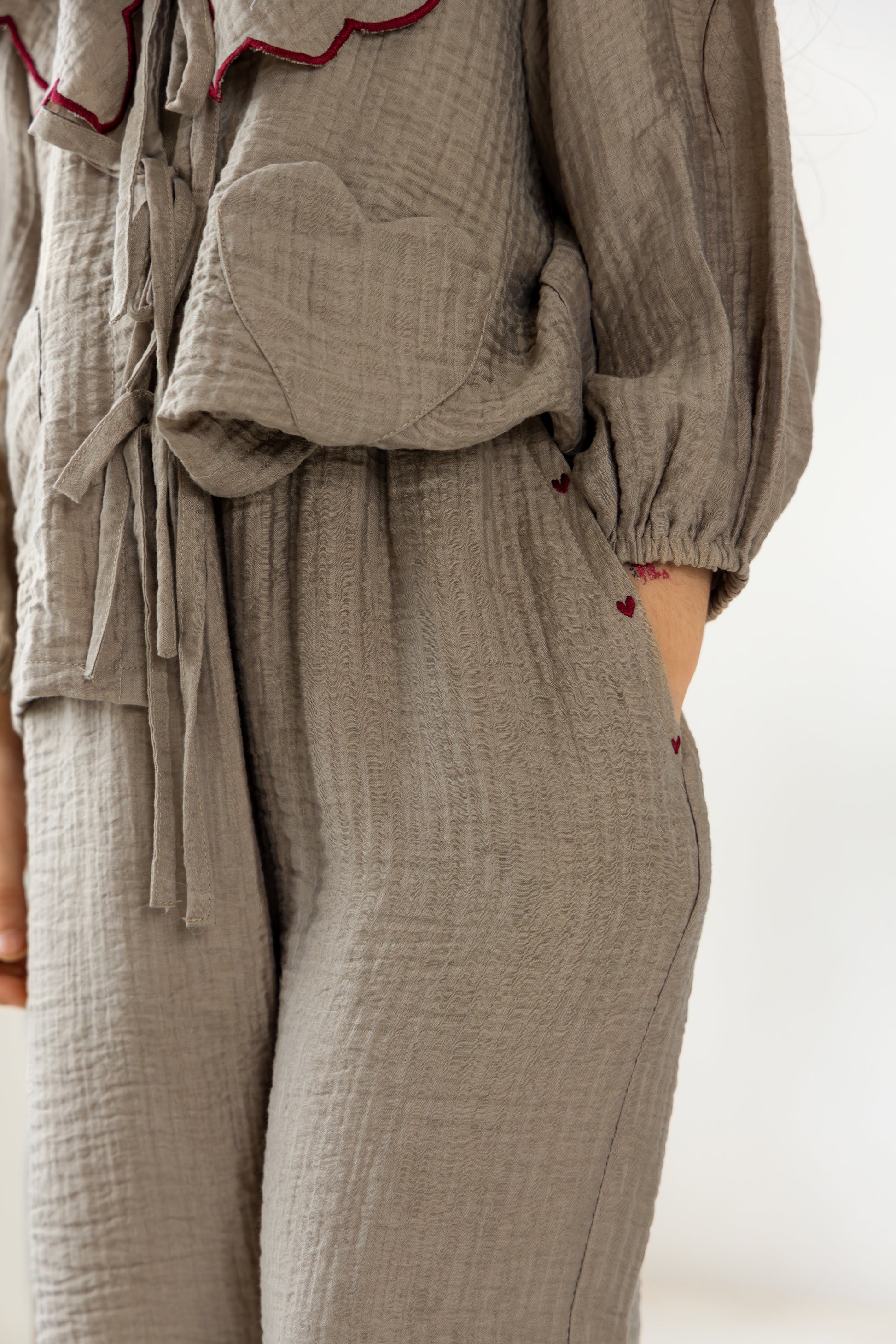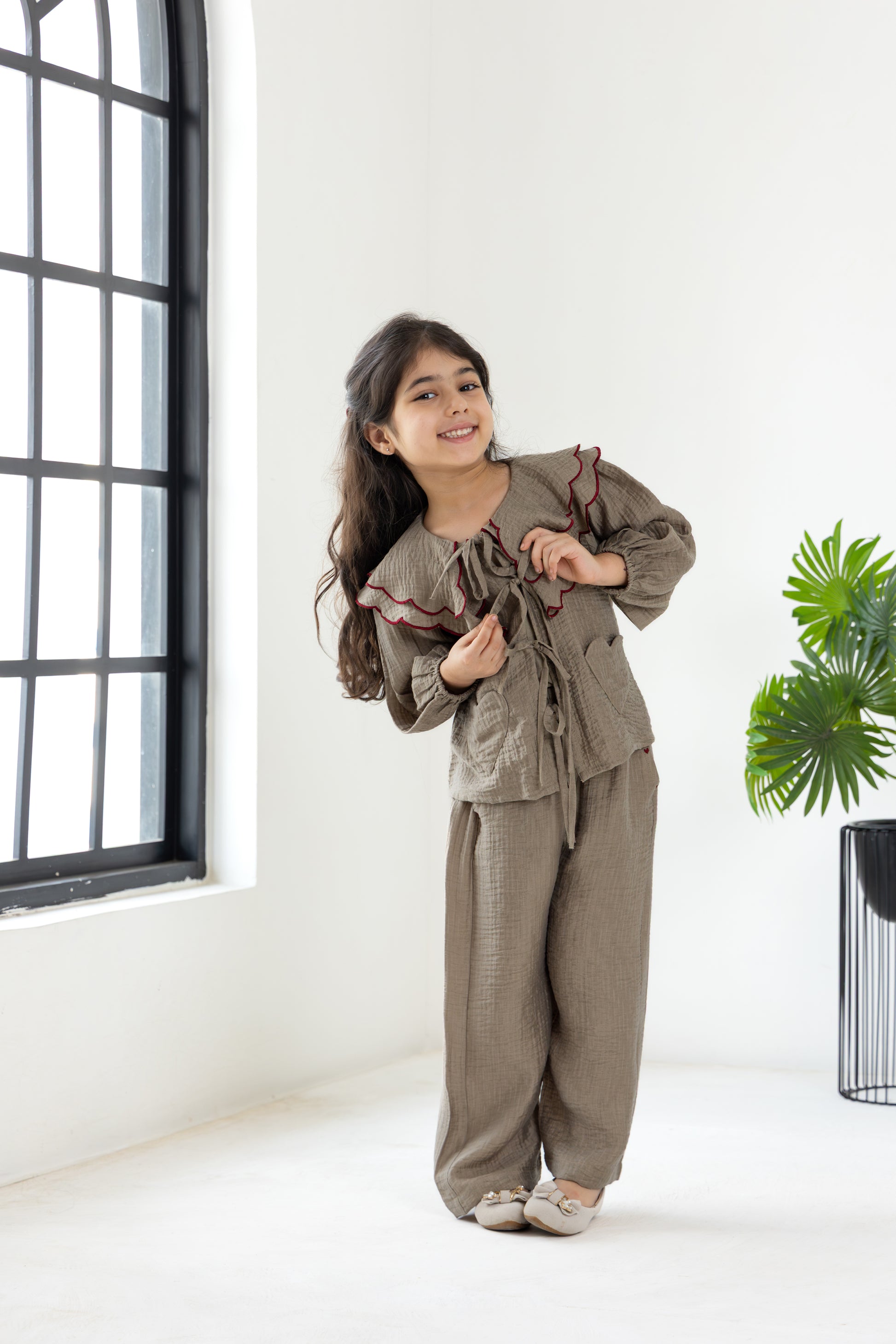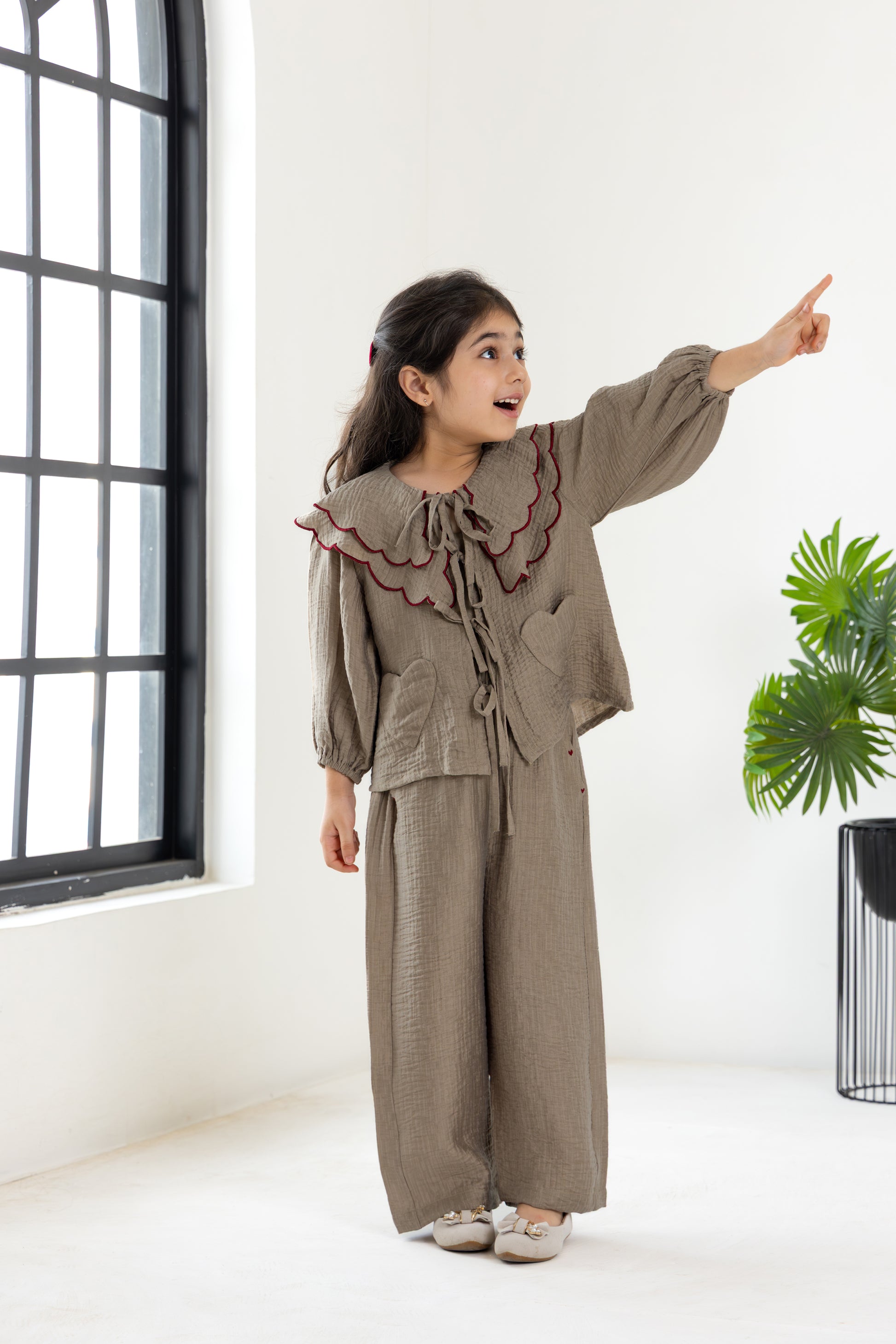 A stylish front tie-up co-ord set featuring a soft tencel fabric top with scalloped neck and contrast scalloped edging. The front of the top is adorned with tie-ups and heart shaped pockets adding a playful and elegant touch. Paired with matching relaxed-fit pants, this outfit blends comfort with effortless charm — perfect for festive days or casual outings.
