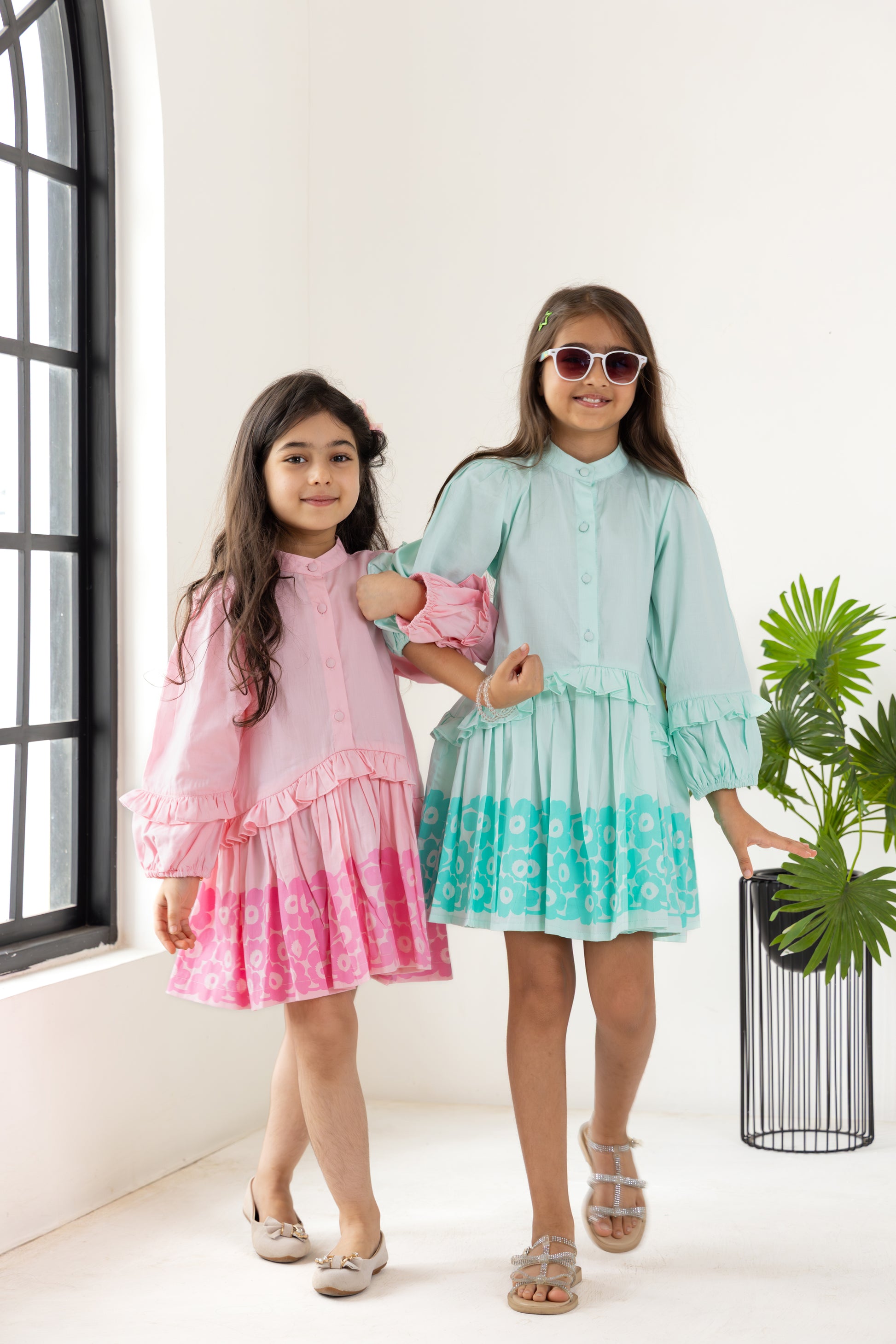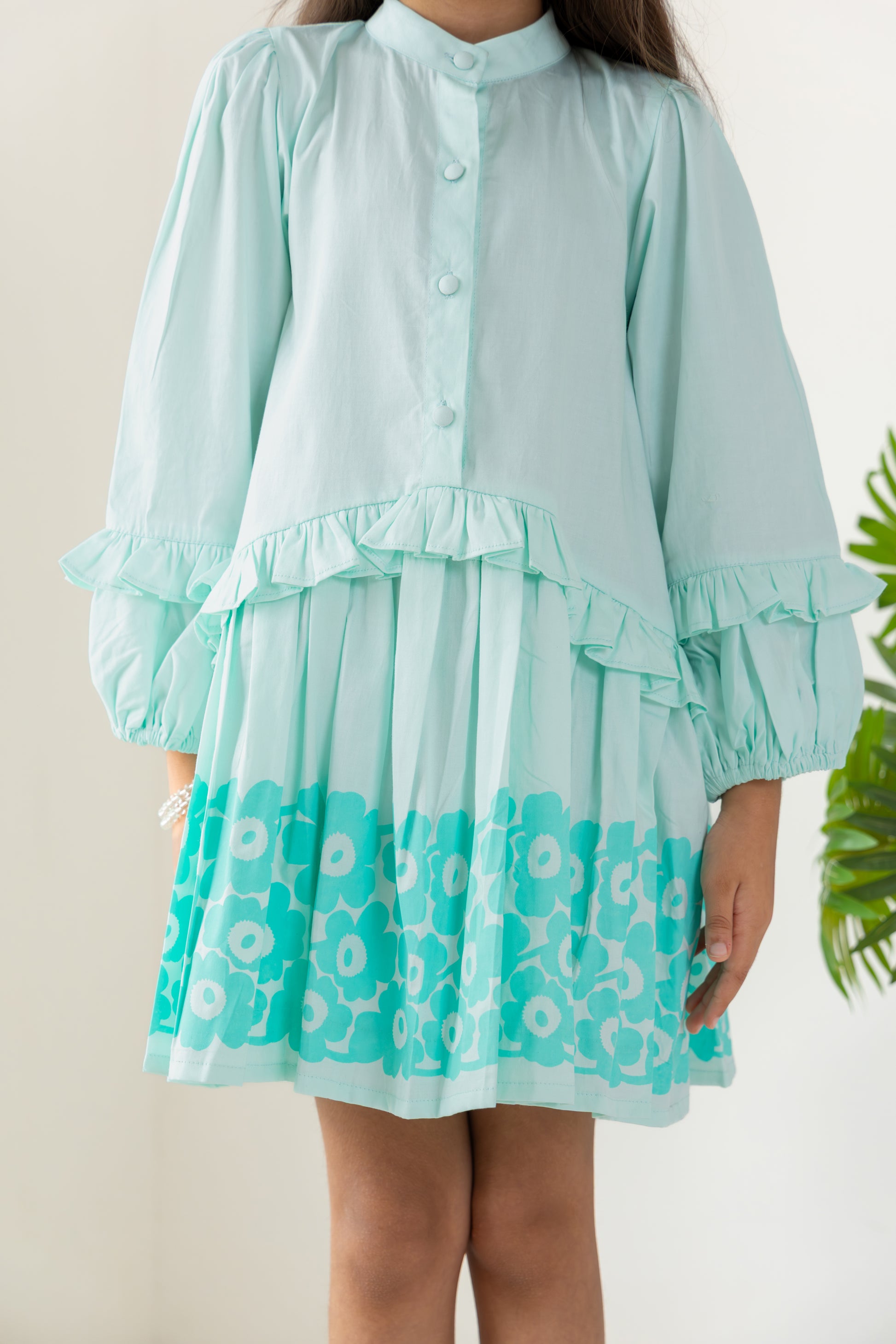 Stylish flared dress for girls featuring aqua blue floral hand printed border and ruffle details. Designed with puff sleeves, a mandarin collar, and front buttons for a chic look. Made from soft, breathable Giza cotton fabric — perfect for parties and casual outings.