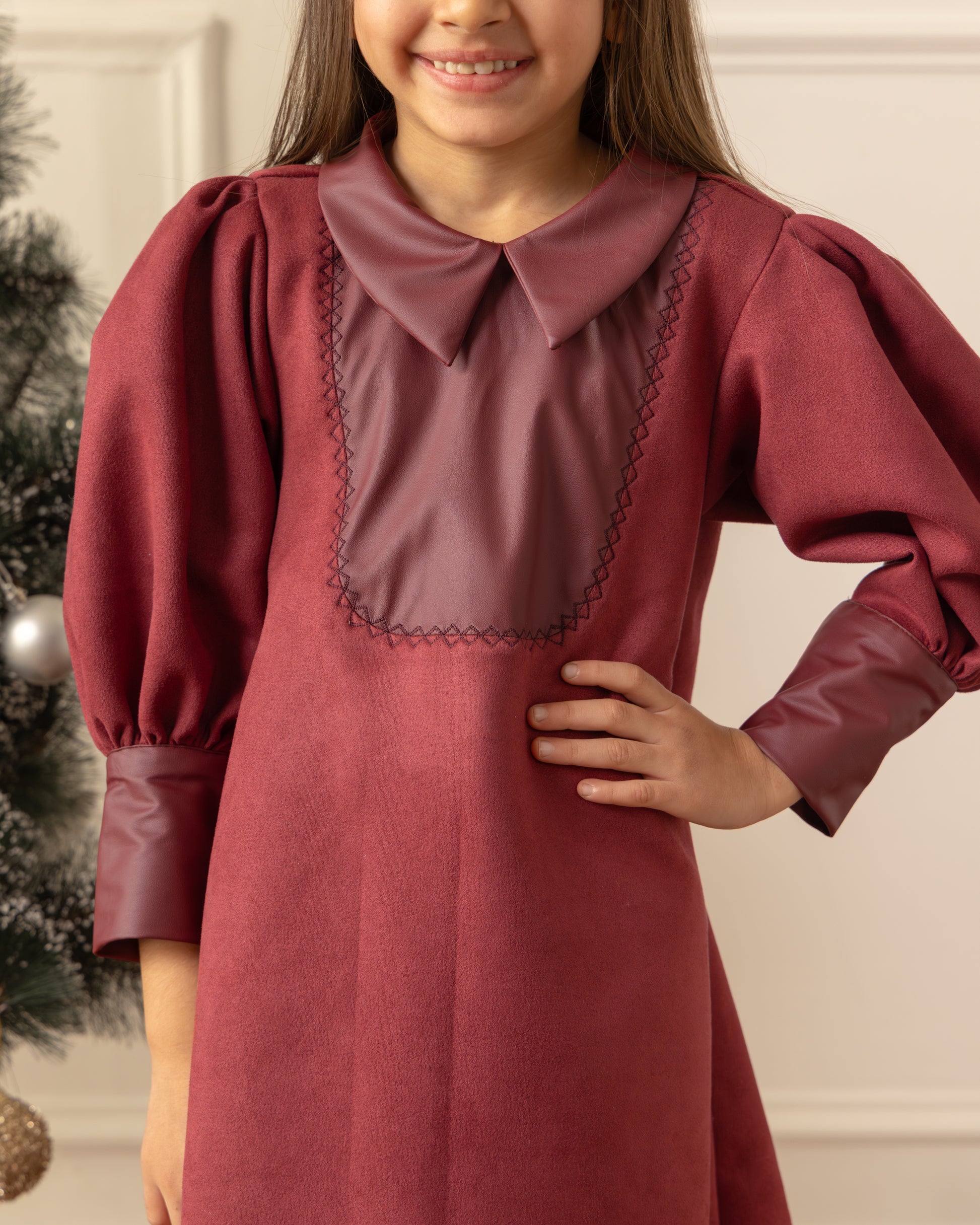 A perfect christmas brunch dress, crafted in holiday shade of suede with a contrasting collar made in leather with embroidery on sides.