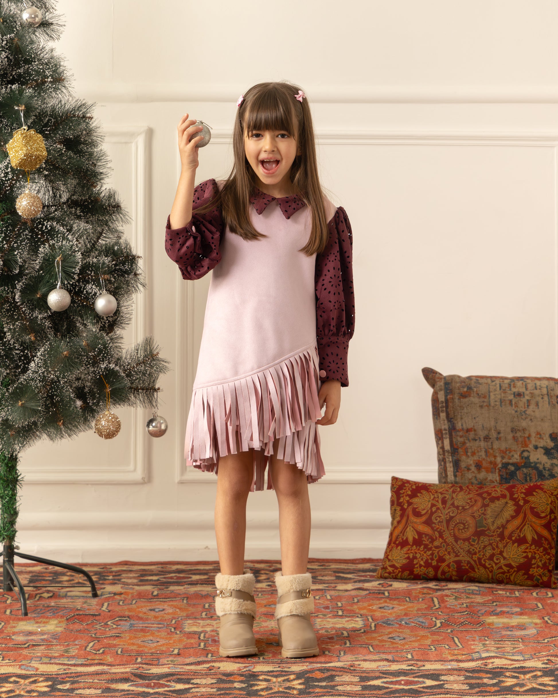 A charming blush-pink dress featuring playful fringe detailing and rich maroon cut work sleeves. Designed with a contrast collar and soft, comfortable suede fabric, this outfit blends elegance with a warm, cozy twist—perfect for special winter outings.