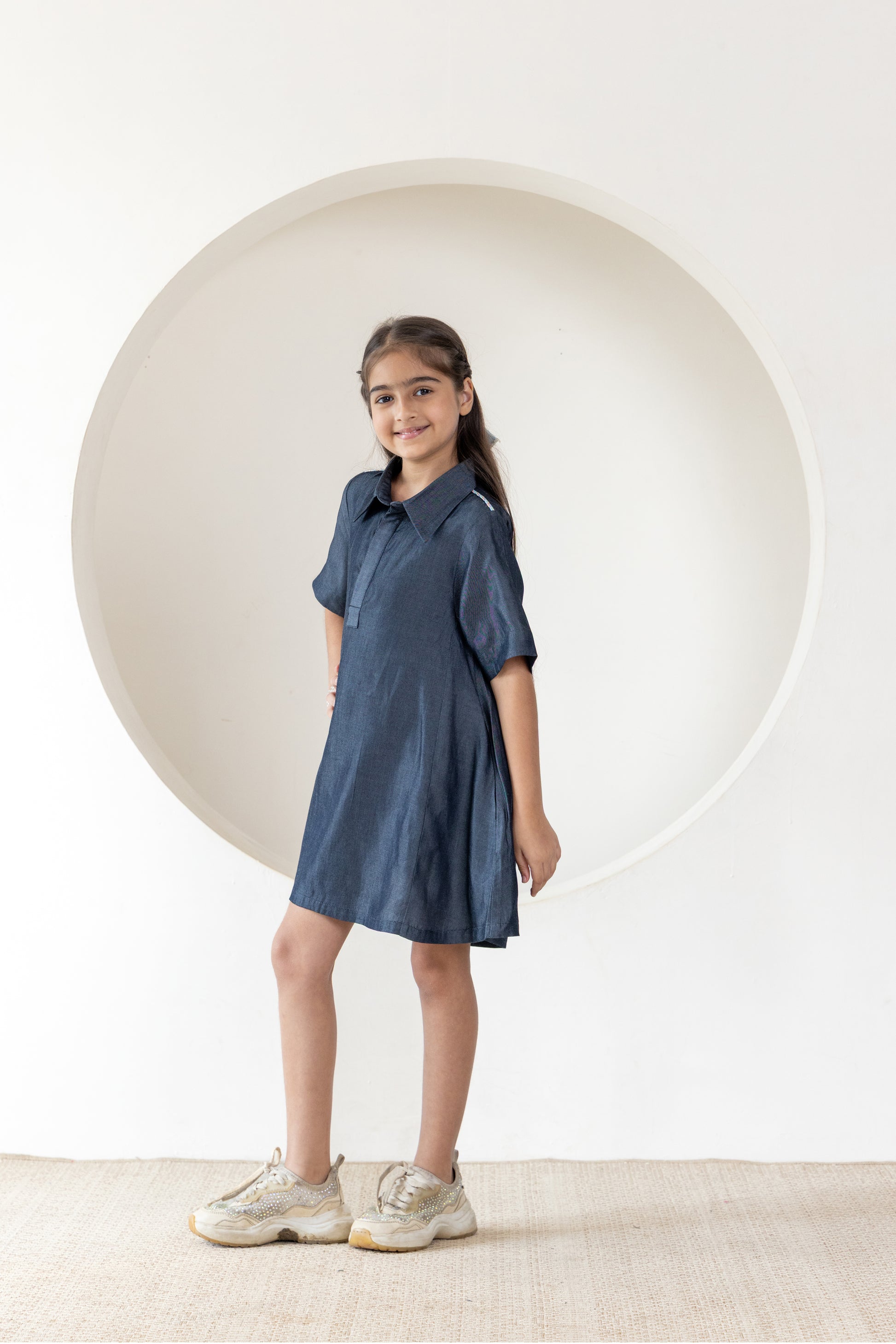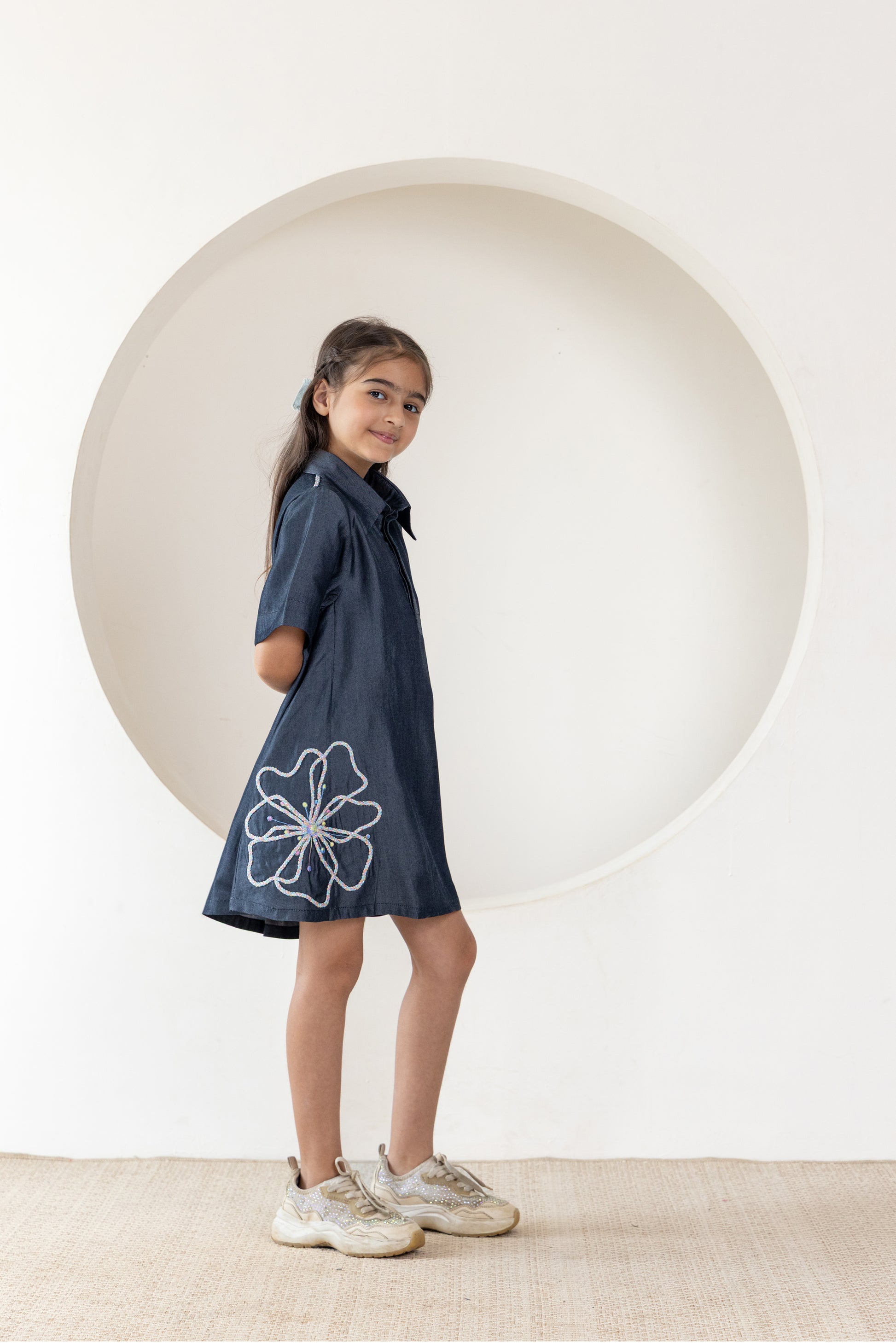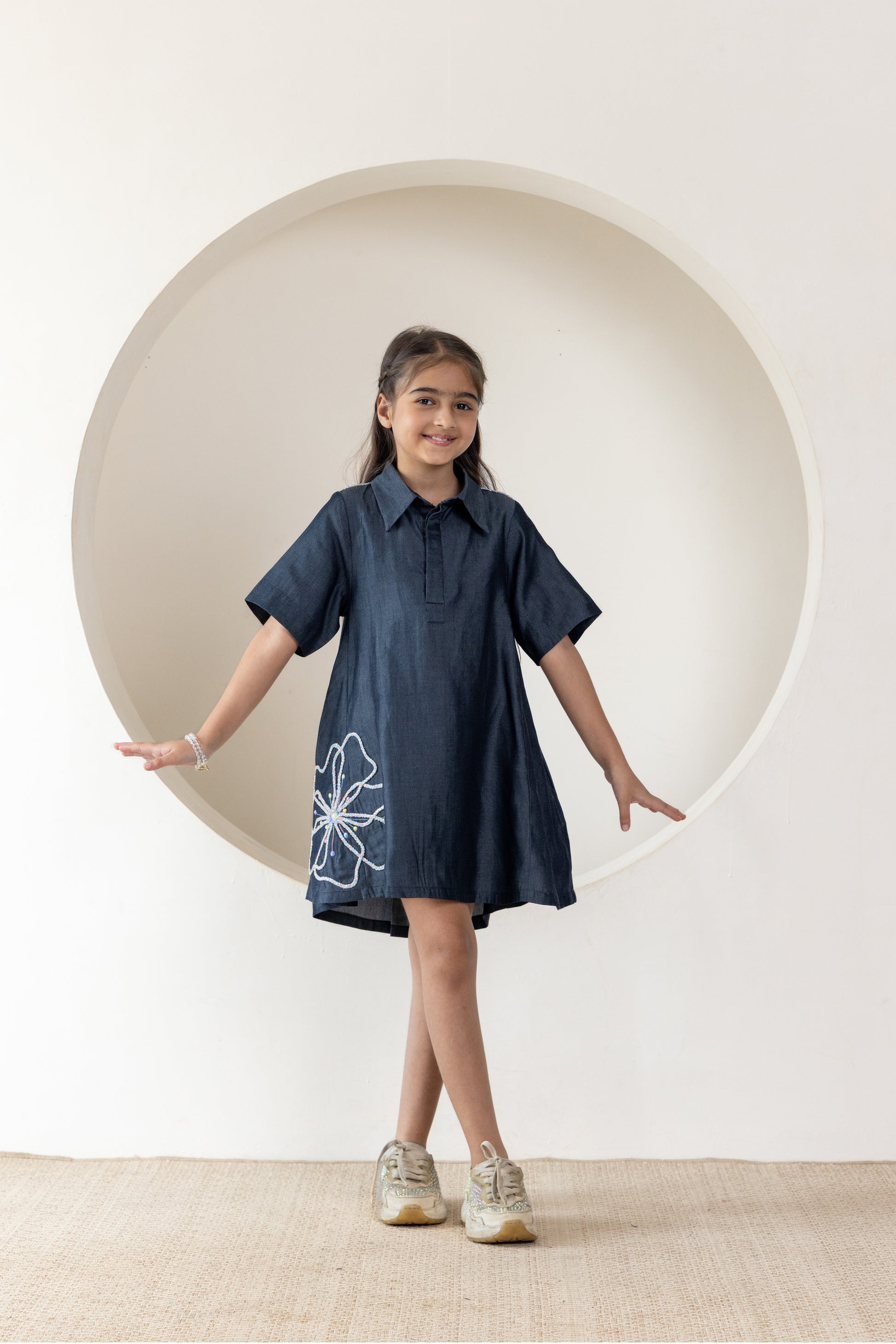 Tencel denim dress so soft that it moves with your child. Embellished with rainbow colour Dori embroidery makes it so unique that it catches attention from everyone around. Perfect dress for those social gatherings and play-dates.